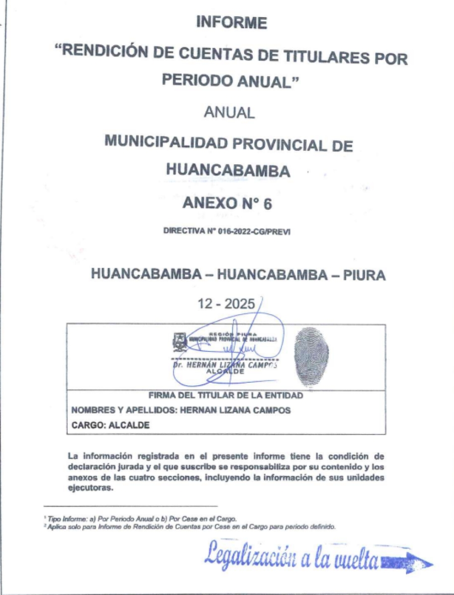 Informe de rendición de cuentas de titulares por periodo anual de la municipalidad provincial de Huancabamba 2025.